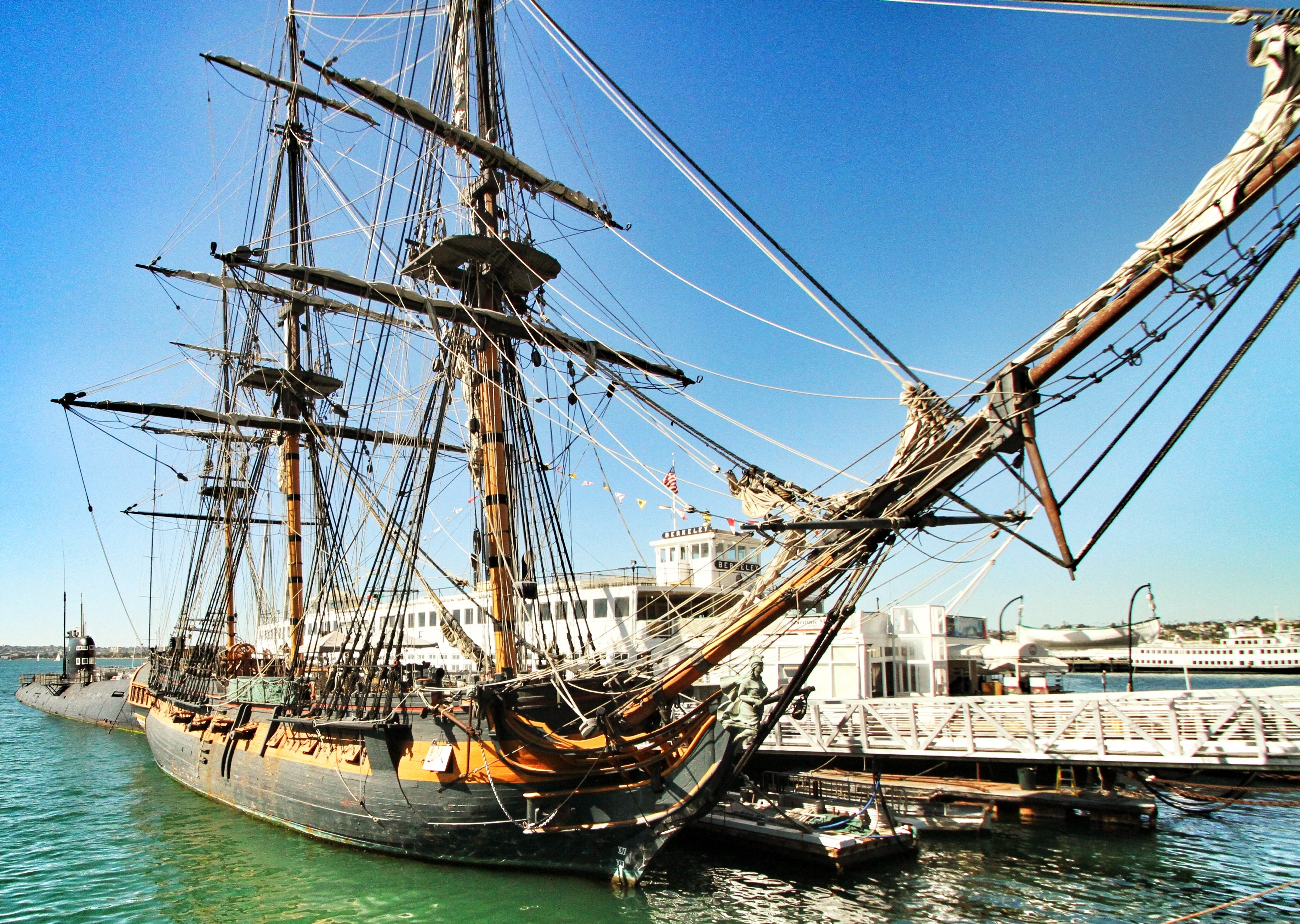 Big, decisive naval battles of this era were fought with the period equivalent of modern battleships: three-masted sailing ships with guns ranging in number from the 50s to the 90s. Here are HMS Victory, an English ship (shown from the air to show how big she is), and a model of one of the larger French ships.