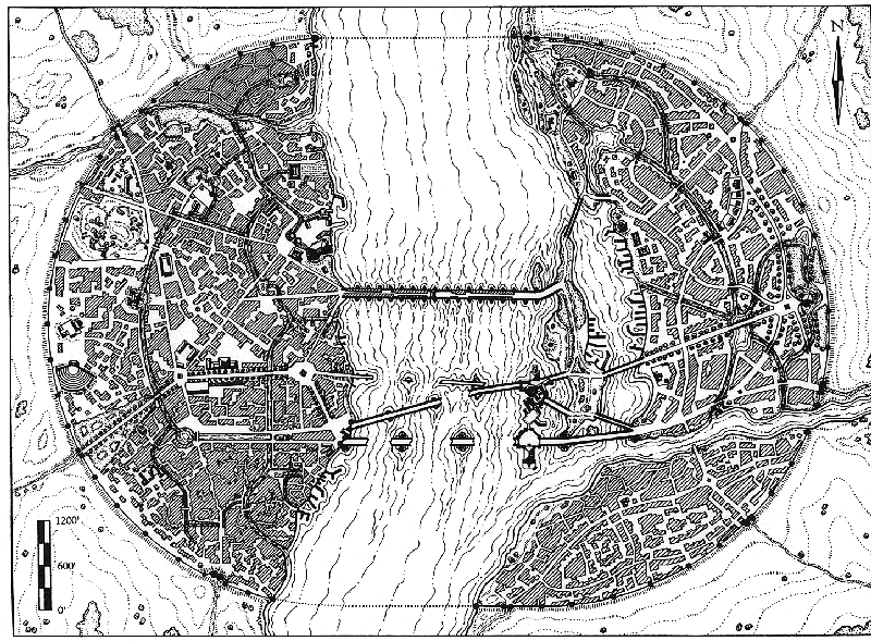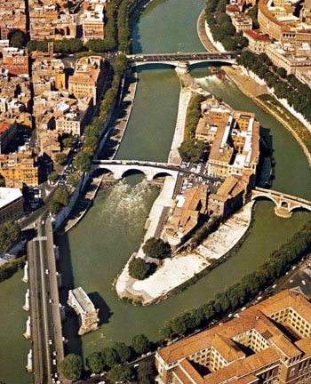 Although there have been very creative attempts to map or depict Cair Andros, for all of its importance in the defense of Gondor, we aren’t given much detail. Its name means “Ship of Long Foam” , called so because of its shape and its action in breaking up the flow of the Anduin. This brought to our minds the Isola Tiberina on the Tiber in Rome,