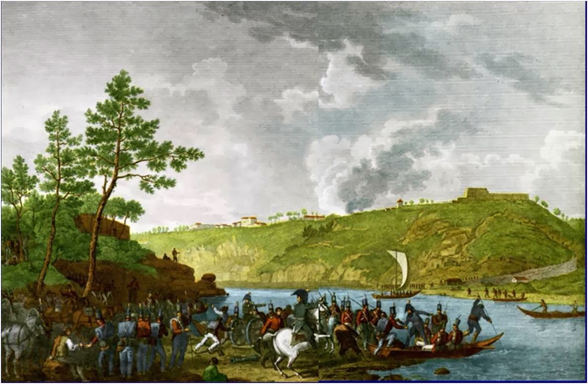 19th-century armies commonly traveled with pontoons—boats built specifically to be used as the basis for floating bridges—