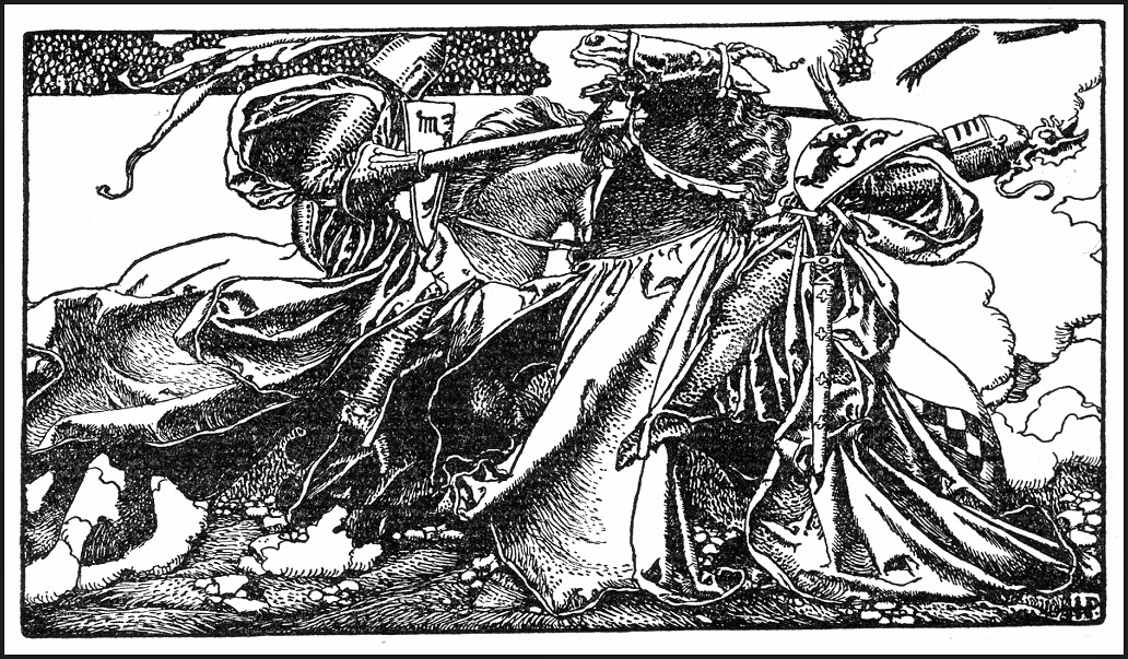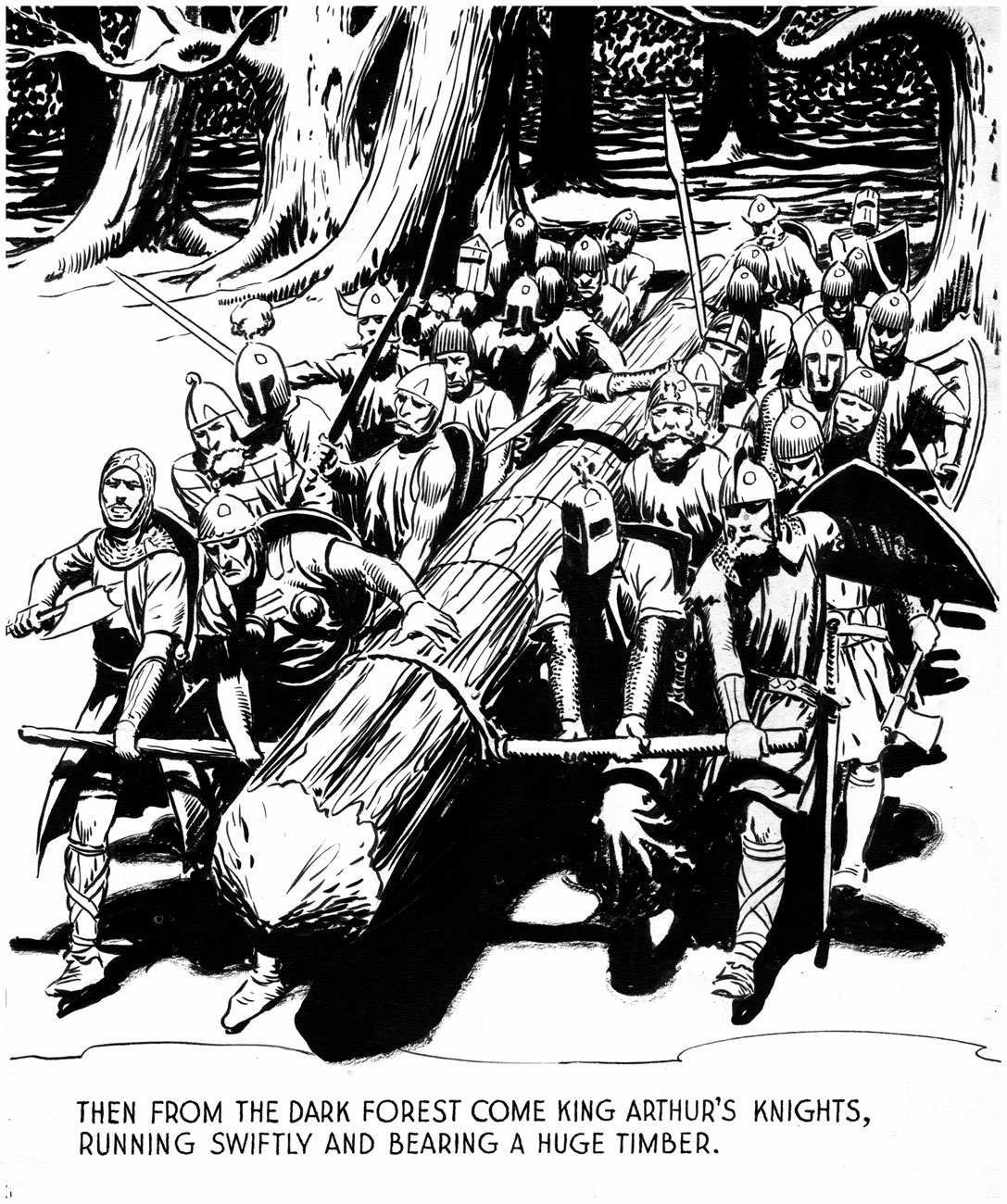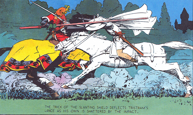 Prince Valiant’s look, of course, comes, in part, from Hal Foster’s own favorites—just compare this from Pyle’s The Story of King Arthur and His Knights (1903).