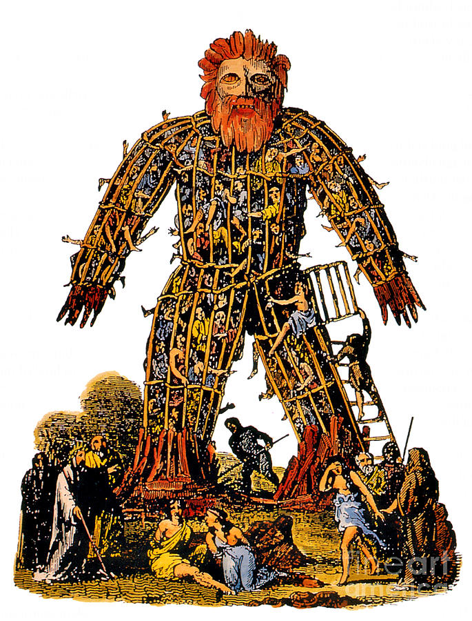 “Others have sacrifices with an image of immense size, the limbs of which, woven from twigs, they fill with living people. When those limbs have been set alight, the people, surrounded by flame, are killed.”