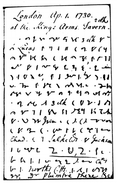 Instead of being based upon a huge collection of symbols, Byrom’s system was based upon capturing sounds—here’s a 1730s journal entry by him using his method.