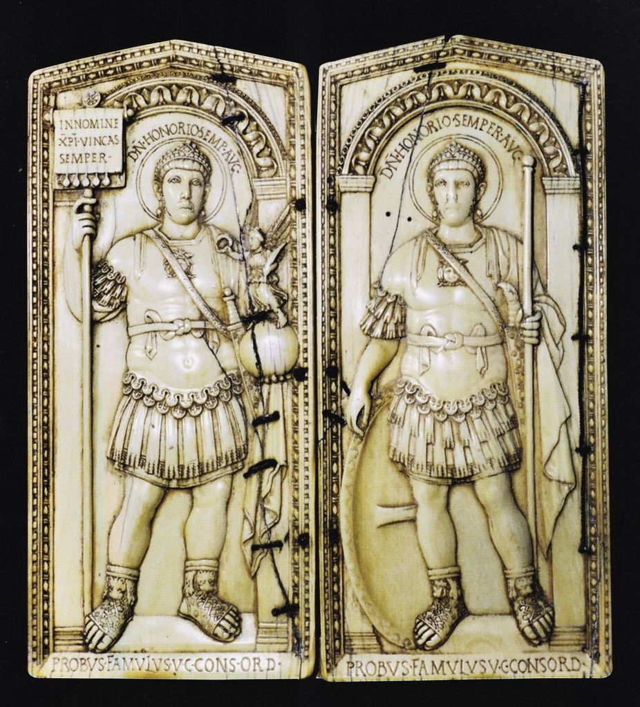 It is called a “consular diptych” (Greek di—“two/double” + ptukhe, “fold”) and consists of two panels, which could be made of wood, ivory, or metal. This particular one, seemingly the oldest surviving, dates from 406AD, and depicts the late western emperor, Honorius (384-423AD)—who had been consul once, himself—at the age of 2—and was dedicated to him by Anicius Petronius Probus, who was consul in 406. It’s a very graphic contrast to the power of the consuls of the old Republic that Probus describes himself as the famulus, “household slave” of Honorius.