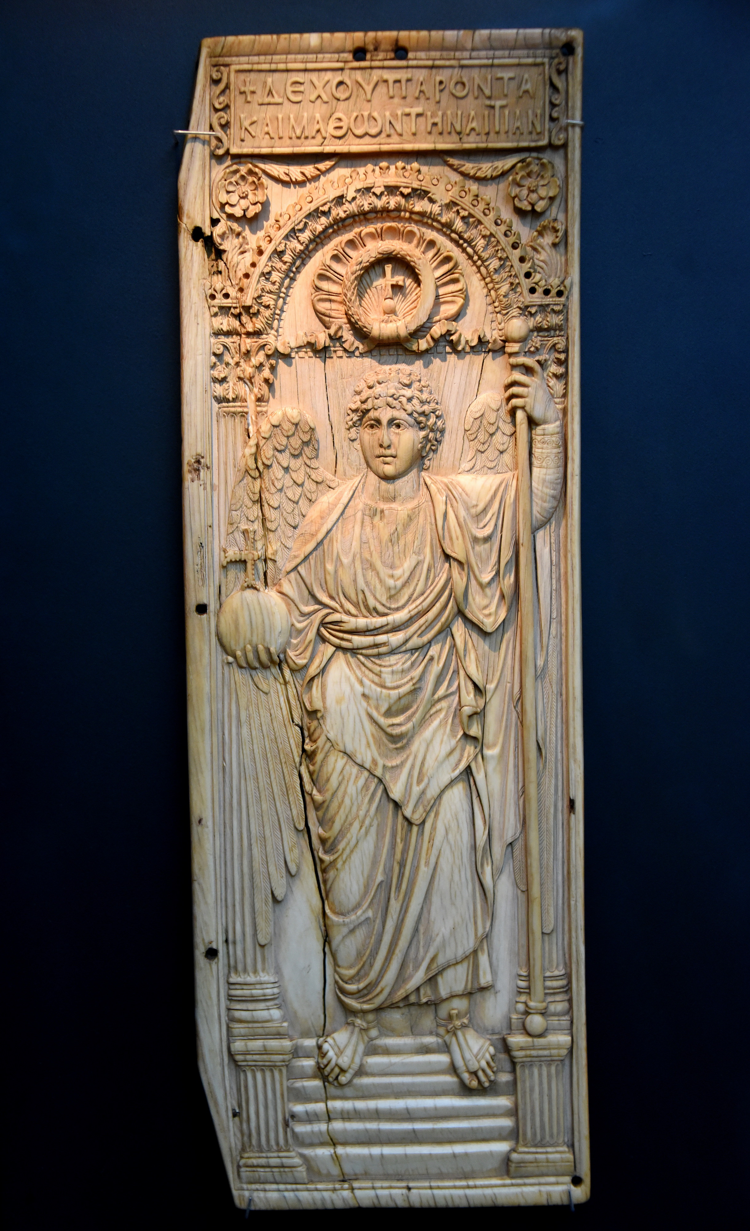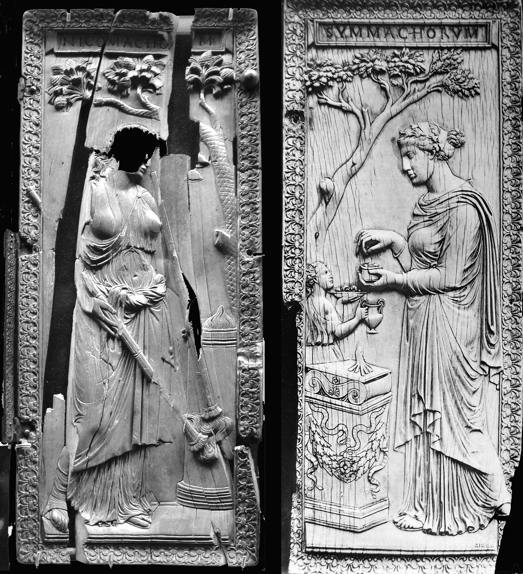 which, although it’s a diptych, isn’t actually a consular one, its purpose being unknown. It has the names of two prominent late Roman families, the Symmachi and the Nichomachi, along the top, however, suggesting that, whatever it was for, it somehow involved them and, in particular, two women of the families, who appear to be acting as religious figures. (The left-hand panel was badly damaged in a fire, unfortunately.)