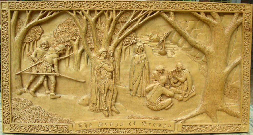 “This is an original composition based on a children’s story I was hoping to write illustrated with a series of carvings – If only I had the time. This carving measures 31″ x 15″. The story goes something like this. Long ago the woodsmen of the north were aided by the city dwellers of the south. The woodsman vowed to aid the city dwellers if ever they were in need. To secure this promise a spell was placed on a series of songs that would awaken future generations to the promise of aid. This carving represents a princess (of course) of the besieged city’s king who travels north with the court musician to garner the assistance of the woodsmen. The first songs are being sung.” (from the website, lightly edited by me)