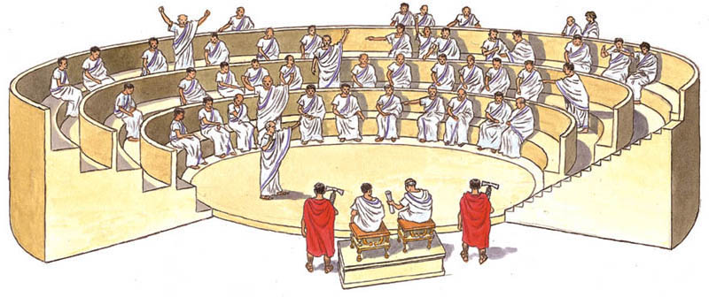 Then, in 509BC, the Romans overthrew the king and established a new kind of state, that Res Publica. They retained the former kings’ council of elders, which they called the Senate, after the Latin root sen-, “old”, but, instead of a king, the Romans yearly elected two state officers, the consuls. Here are the two consuls in a session with the Senate.