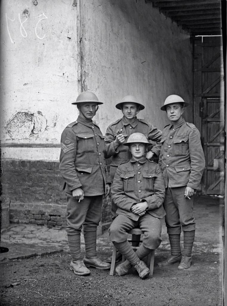 (A footnote here: soldiers might actually wear the strap on the back of the head during combat, as it was believed that the concussion from a shell burst in front would throw the brim of the helmet back and the strap might then snap a soldier’s neck. Here’s a British soldier just behind the front with the strap in the rear.)