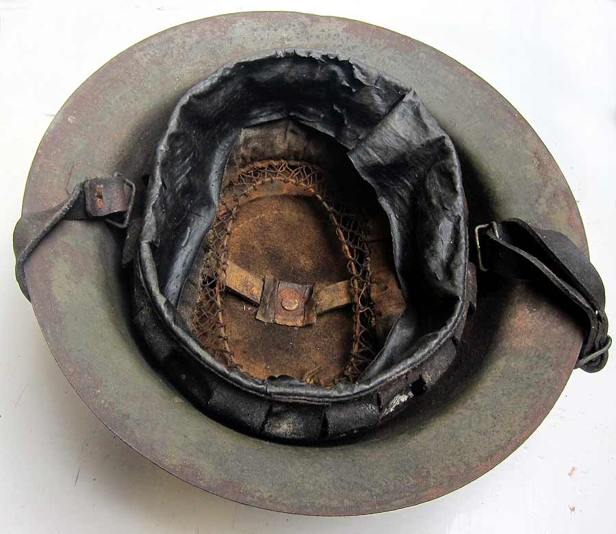 At the lower edge of the helmet, you can see a whole line of holes. If you wore a helmet so that there was nothing more than bare metal above your skull, it would not only be very hot in summer, which was the main campaigning season throughout the centuries, but a blow to the helmet would, potentially, drive the metal directly into the wearer’s head. Those lower holes, then, are for a liner—of just the sort you see in this Great War helmet, like those on the British soldiers in the images above.