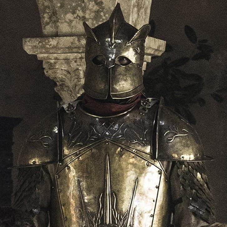 Although he’s dressed for battle or a tournament, notice the lack of an arming cap, just like Jaime Lanister. What might happen to his head if someone used an axe on that helmet?