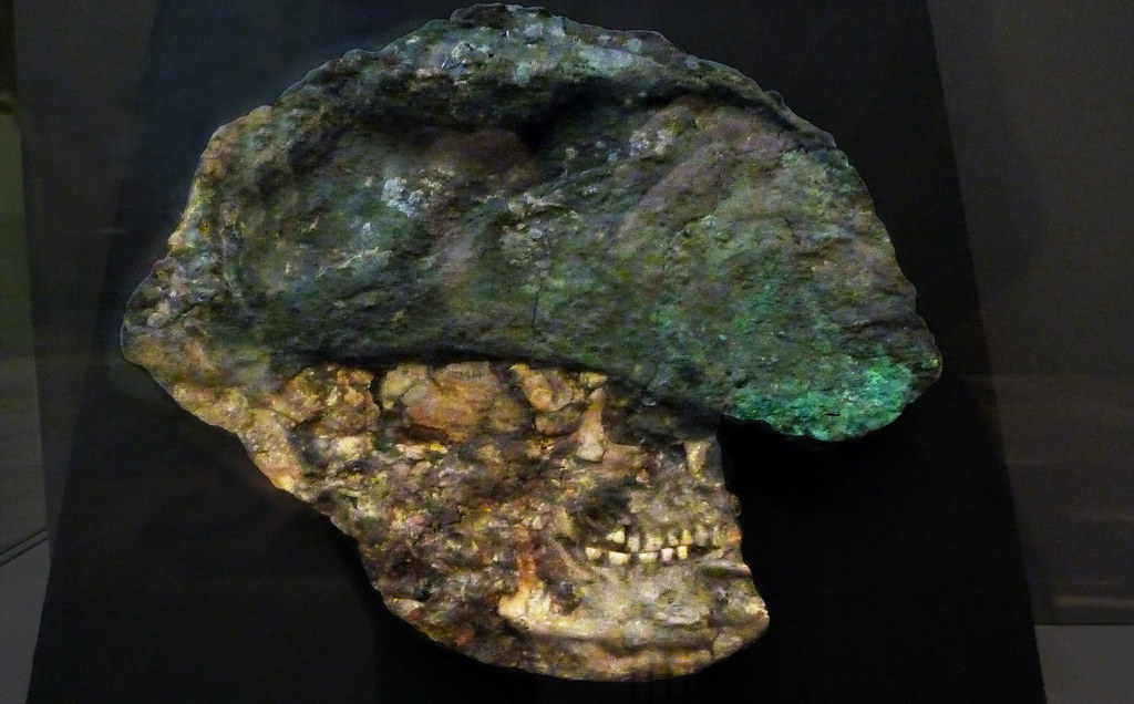 but their early contemporaries, the Sumerians, produced bowl-shaped helmets of copper, as this skull, with its helmet (from the tomb of Queen Pu-abi, c.2600bc) still more-or-less intact, shows us,