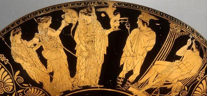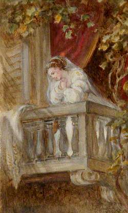 Her hand on her bosome her head on her knee,