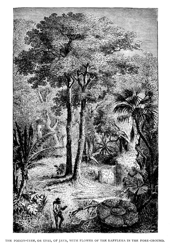 Travelers’ tales reported that the plant gave off a kind of noxious fume which poisoned the landscape for 10 miles around, leaving the vicinity empty save for the bones of unwary animals and people. Although this was proven to be more than an exaggeration in the early 19th century, a deadly poison can be extracted from the tree and was used by various indigenous peoples to tip their darts and arrows.