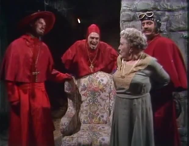 The Spanish Inquisition has burst onto the scene, grabbing a nice old lady and accusing her of heresy. She is, not surprisingly, a bit confused and so they begin a series of horrible tortures, including–