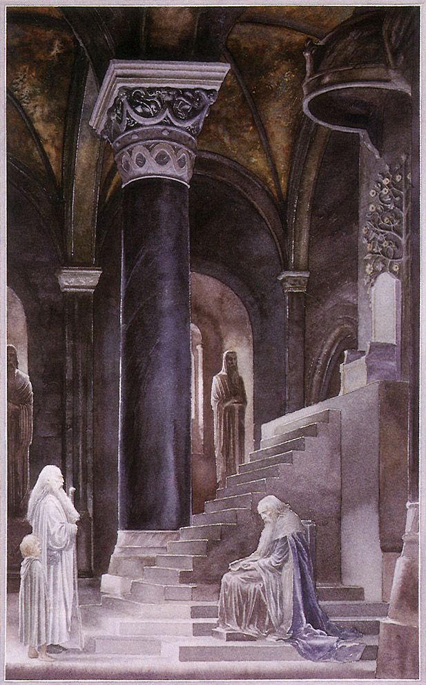 “At the far end upon a dais of many steps was set a high throne under a canopy of marble shaped like a crowned helm; behind it was carved upon the walls and set with gems an image of a tree in flower. But the throne was empty. At the foot of the dais, upon the lowest step which was broad and deep, there was a stone chair, black and unadorned, and on it sat an old man gazing at his lap. In his hand was a white rod with a golden knob. He did not look up…