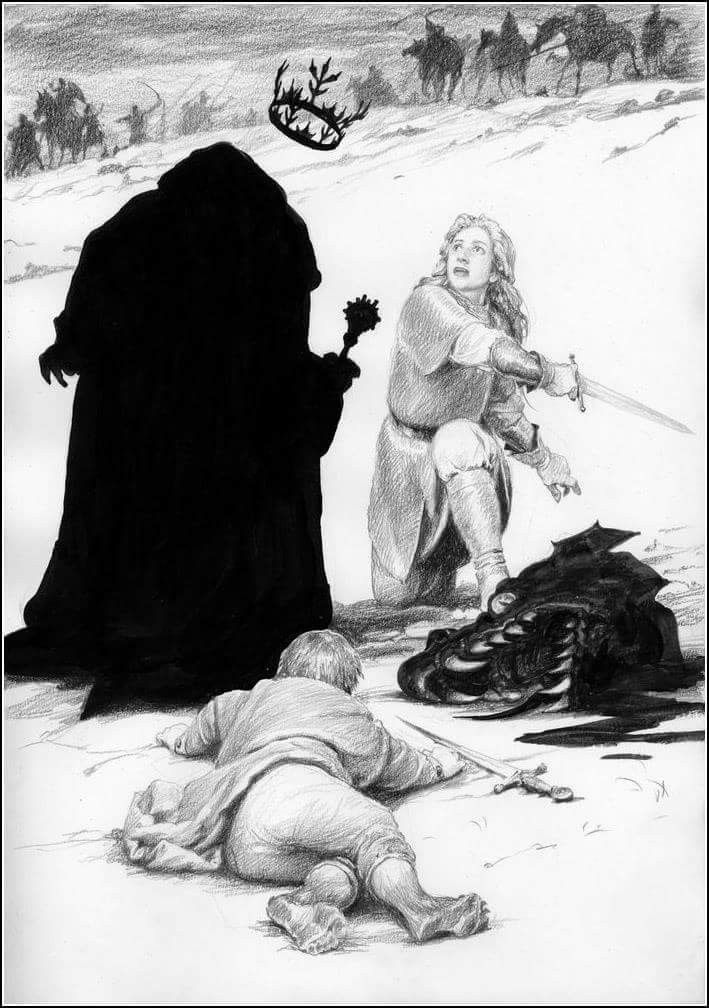 (I’ve always liked this image, which suggests the tapestry identified by Aragorn in Edoras: “ ‘Behold Eorl the Young!…Thus he rode out of the North to the Battle of the Field of Celebrant.’ “ The Two Towers, Book Three, Chapter 6, “The King of the Golden Hall” )