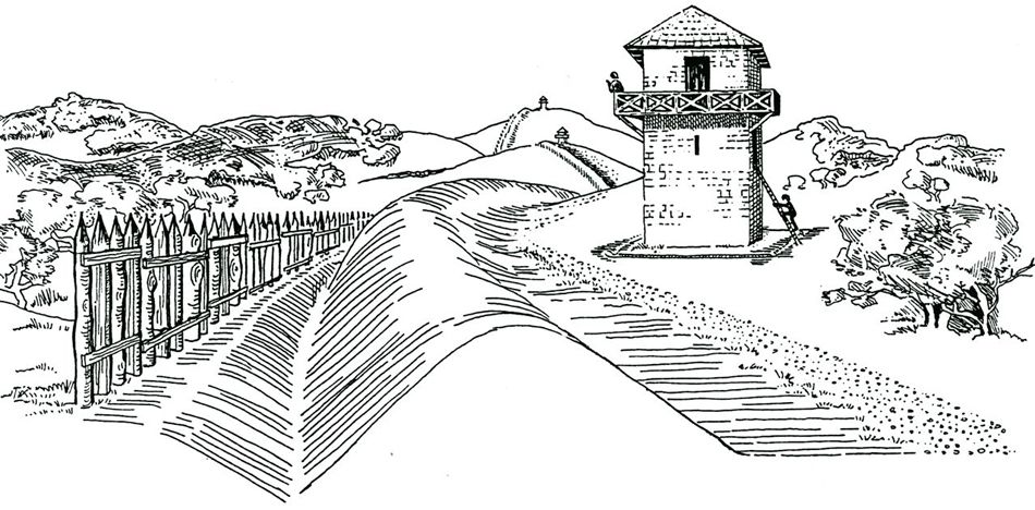 but hundreds of miles of ditch with a palisade and earth wall behind it,