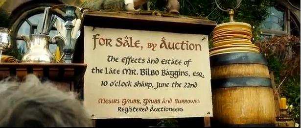 If he was surprised, they were more surprised still. He had arrived back in the middle of an auction! There was a large notice in black and red hung on the gate, stating that on June the Twenty-second Messrs Grubb, Grubb, and Burrowes would sell by auction the effects of the late Bilbo Baggins Esquire, of Bag-End, Underhill, Hobbiton.”