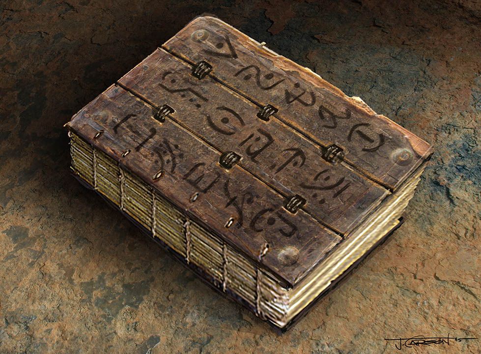 “There were many recesses cut in the rock of the walls, and in them were large iron-bound chests of wood. All had been broken and plundered; but beside the shattered lid of one there lay the remains of a book. It had been slashed and stabbed and partly burned, and it was so stained with black and other dark marks like old blood that little of it could be read. Gandalf lifted it carefully, but the leaves cracked and broke as he laid it on the slab. He pored over it for some time without speaking. Frodo and Gimli standing at his side could see, as he gingerly turned the leaves, that they were written by many different hands, in runes, both of Moria and of Dale, and here and there in Elvish script.” (The Fellowship of the Ring, Book Two, Chapter 5, “The Bridge of Khazad-dum”)