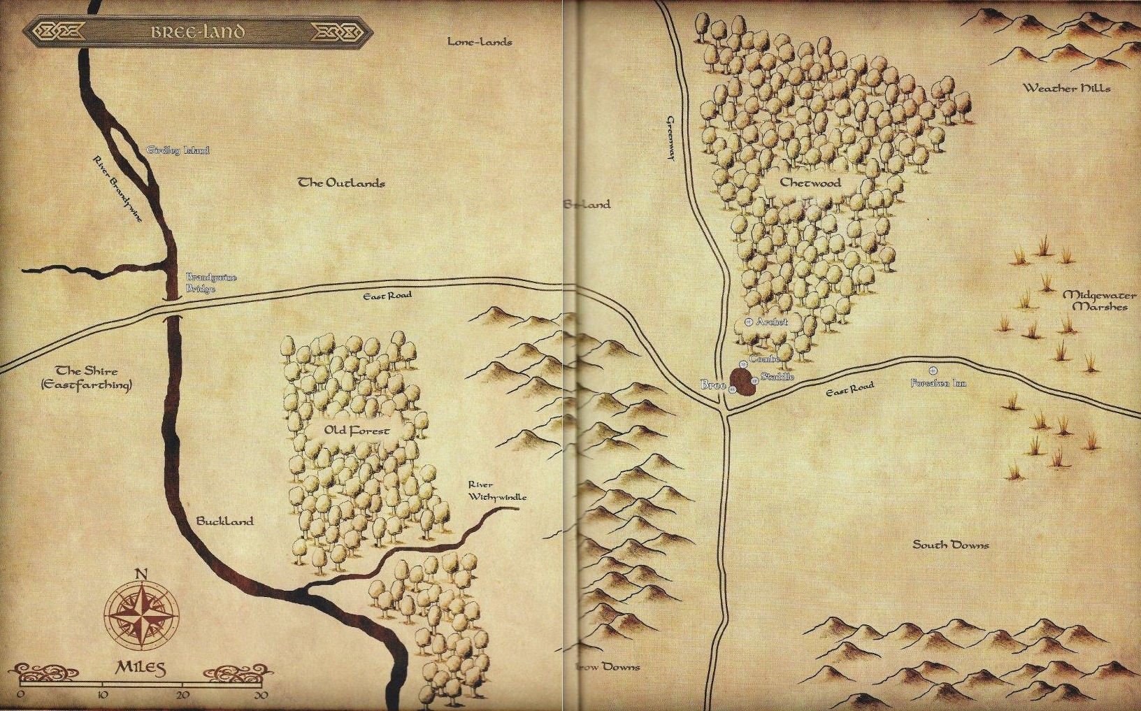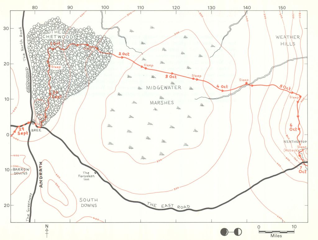 “It was late in the afternoon when the leaders came to wide grey thickets stretching beyond the eastward side of Amon Din, and masking a great gap in the line of hills that from Nardol to Din ran east and west. Through the gap the forgotten wain-road long ago had run down, back into the main horse-way from the City through Anorien; but now for many lives of men trees had had their way with it, and it had vanished, broken and buried under the leaves of uncounted years.” (The Return of the King, Book Five, Chapter 5, “The Ride of the Rohirrim”)