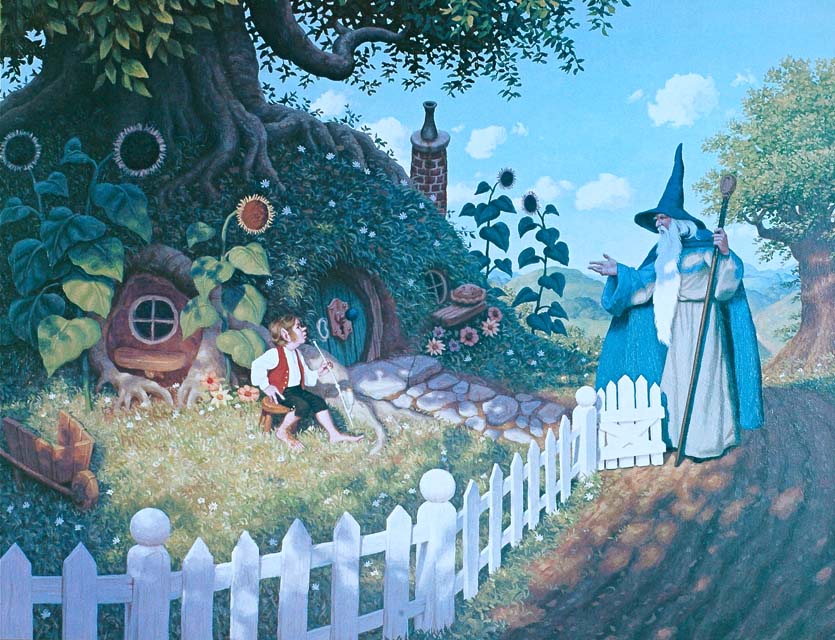 (Alan Lee—notice, by the way, that the usual image of the wall of Edoras isn’t the spindly palisade shown in the films, but a solid stone wall, of the sort JRRT must have meant when he wrote: “Following the winding way up the green shoulders of the hills, they came at last to the wide wind-swept walls and the gates of Edoras.” (The Two Towers, Book Three, Chapter 6, “The King of the Golden Hall”)