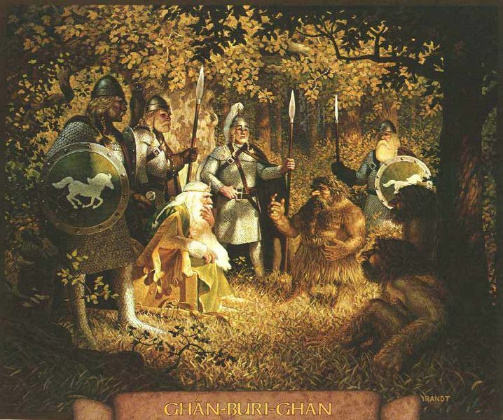 “ ‘Let Ghan-buri-Ghan finish!…More than one road he knows.  He will lead you by road where no pits are, no gorgun walk, only Wild Men and beasts.  Many paths were made when Stonehouse-folk were stronger.  They carved hills as hunters carve beast-flesh.  Wild Men think they ate stone for food.  They went through Druadan to Rimmon with great wains.  They go no longer.  Road is forgotten, but not by Wild Men.  Over hill and behind hill it lies still under grass and tree, there behind Rimmon and down to Din, and back at the end to Horse-men’s road.  Wild Men will show you that road.  Then you will kill gorgun and drive away bad dark with bright iron, and Wild Men can go back to sleep in the wild woods.” (The Return of the King, Book Five, Chapter 5, “The Ride of the Rohirrim”)