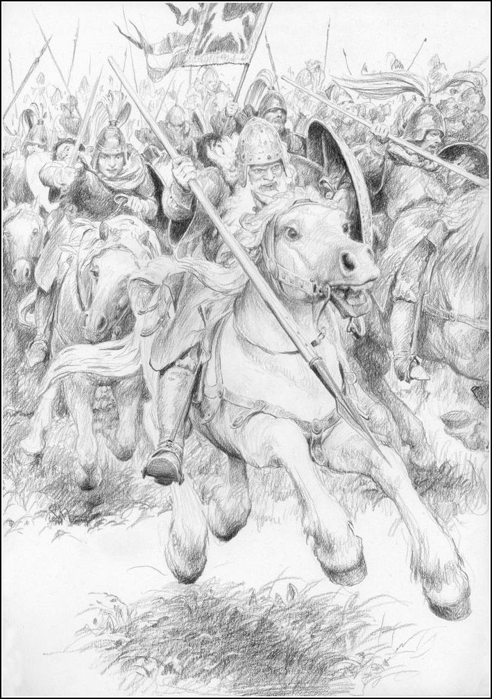 “At that sound the bent shape of the king sprang suddenly erect.  Tall and proud he seemed again and rising in his stirrups he cried in a loud voice, more clear than any there had ever heard a mortal man achieve before: