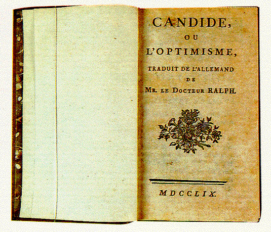 (Because of its controversial nature, the novel was published outside France and, as you can see by this image of the title page of the first edition, not even under the author’s name—for more on this see:  https://en.wikipedia.org/wiki/Candide )