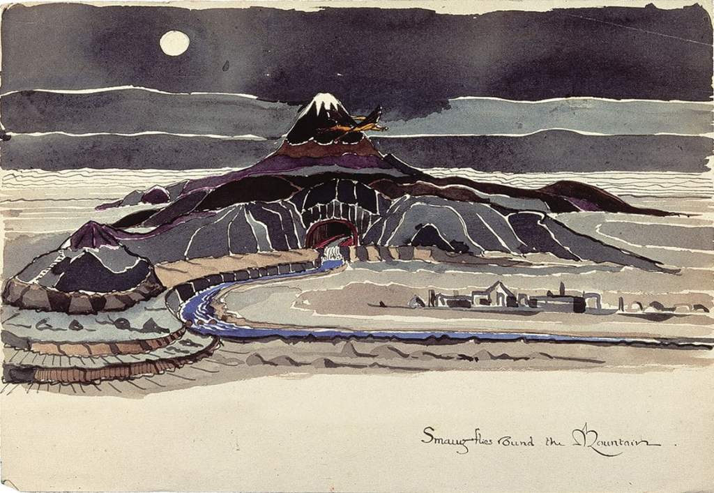 “Fire leaped from thatched roofs and wooden beam-ends as he [Smaug] hurtled down and past and round again…Back swirled the dragon.  A sweep of his tail and the roof of the Great House crumbled and smashed down.  Flames unquenchable sprang high into the night.  Another swoop and another, and another house and then another sprang afire and fell…”  (The Hobbit, Chapter Fourteen, “Fire and Water”)