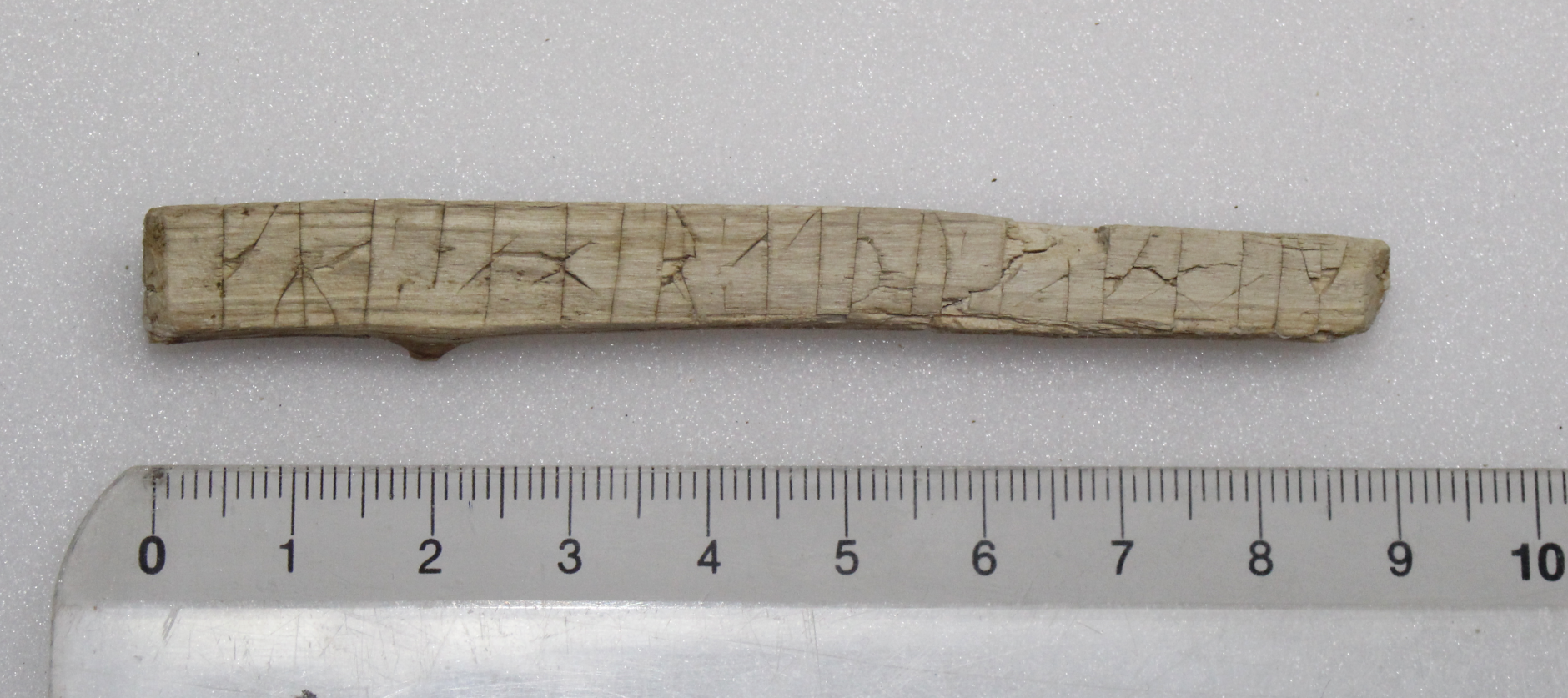 (There seem to be two guesses at to what the inscription says—transliterated, it appears to read “harja”, meaning either the obvious “comb” or the less obvious “warrior”. For more on this and other early rune-marked artifacts, see: https://en.wikipedia.org/wiki/Vimose_inscriptions and https://en.natmus.dk/historical-knowledge/denmark/prehistoric-period-until-1050-ad/the-early-iron-age/the-weapon-deposit-from-vimose/the-offerings-in-vimose/ Until they sold out, you could even get a bone replica of the comb here: https://norseimports.com/products/vimose-comb )