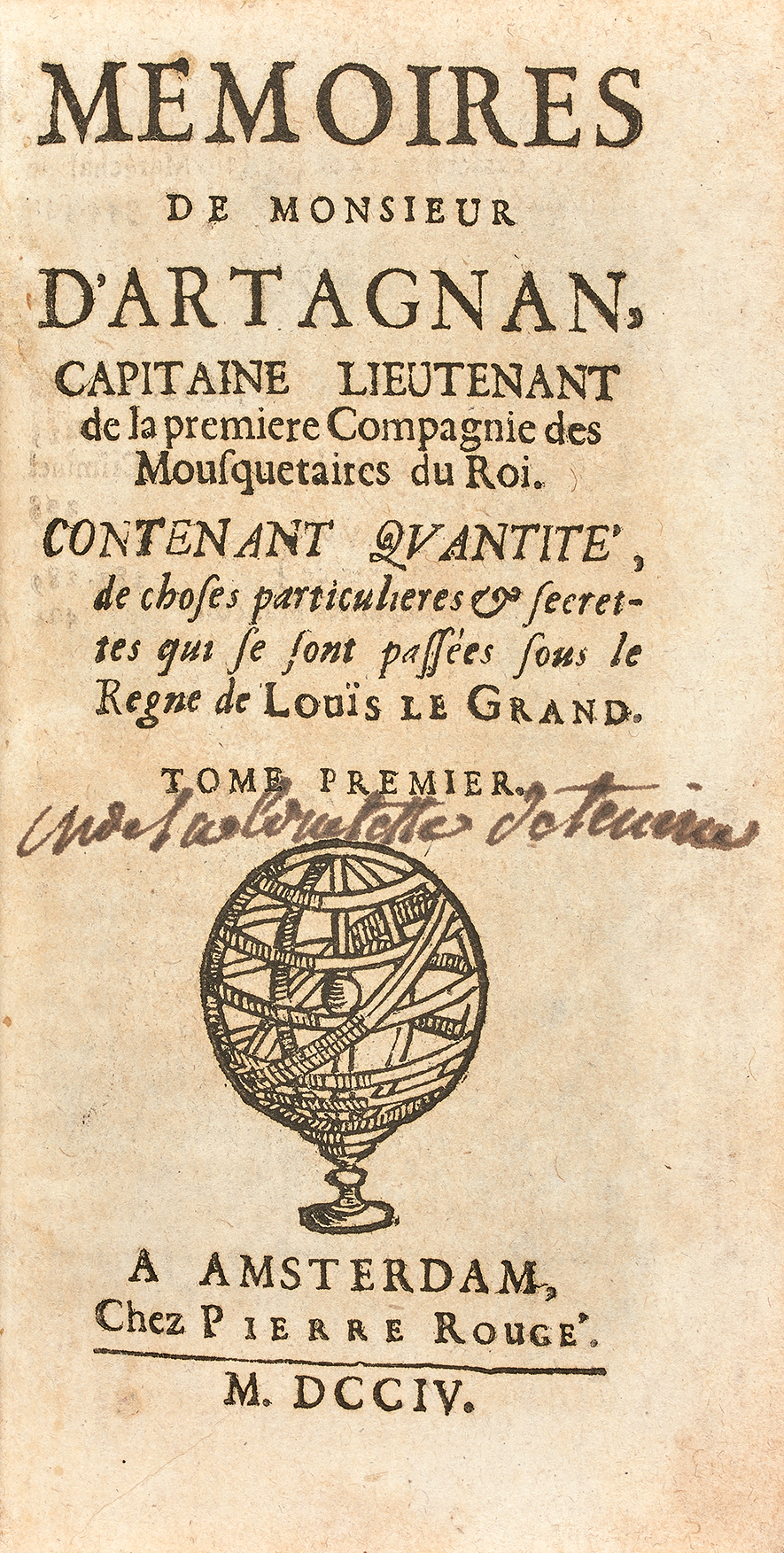 (A 1704 printing. You can read about Gatien here: https://en.wikipedia.org/wiki/Gatien_de_Courtilz_de_Sandras and read the first English translation of his fictionalized work here: https://archive.org/details/memoirsofmonsieu01couruoft/page/n7/mode/2up This is Volume 1 of 3, all being available at the Internet Archive, where you’ll find this volume.)